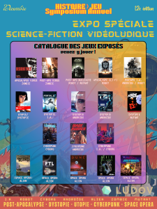 Le catalogue des jeux exposés (ci-joint) vous offre un panorama des imaginaires de science-fiction, incluant divers sous-genres dont l’apocalypse et le post-apocalypse, la dystopie et l’utopie, le cyberpunk et le space opera ; autant d’imaginaires où guettent zombies, mutants, aliens, I.A., robots, cyborgs et androïdes.